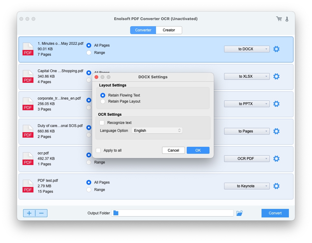 Enolsoft PDF Converter OCR can convert your documents to PDF, with original integrity, readability and quality retained. It will preserve the formatting for fonts, margins, tables, charts, etc., it also keeps the original layout, same image resolution and so on. There is no need to rebuild your documents after the conversion.