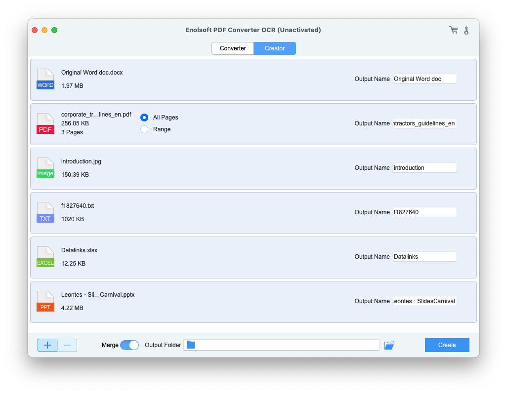 Enolsoft PDF Converter OCR allows users to create PDF from 10+ file types: Word, Excel, PowerPoint, Pages, Keynote, Numbers, CHM, ePub, HTML, Text, RTF, JPEG, PNG, GIF, BMP, TIFF, TIF, JPG. Also, you can merge multiple PDFs, and multiple documents in different formats into one PDF.