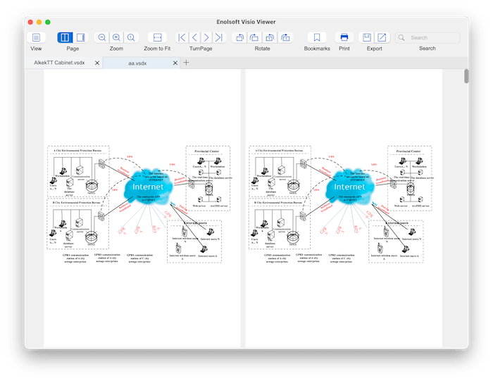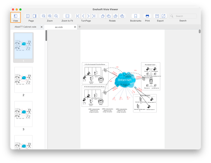 Enolsoft Visio Viewer provides flexible viewing modes to improve how you read and compare diagrams. After opening the Visio file, you can view the file content with/without thumbnail, page by page or two pages.