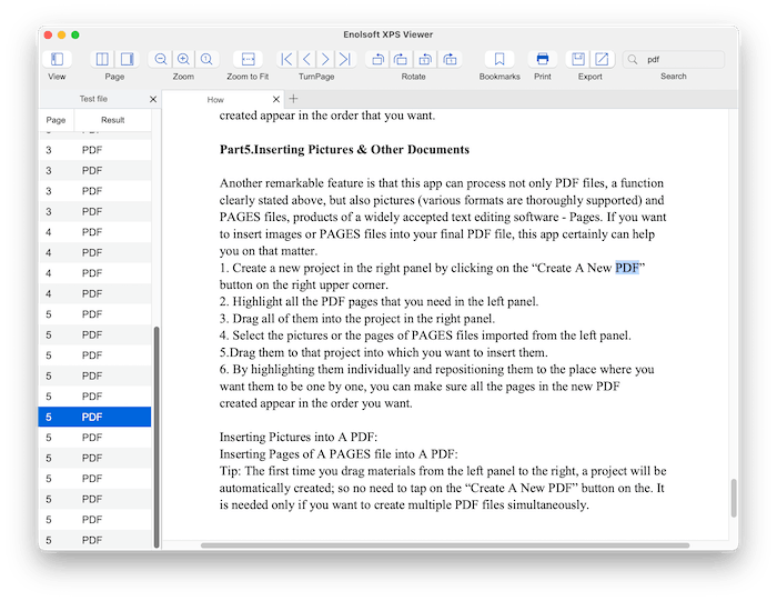 You can enter keywords in the search bar to quickly find match content from your XPS file. All the content that containing the keywords will be listed on the left panel, choose it on the list and the corresponding content will be highlighted and displayed on the right side.