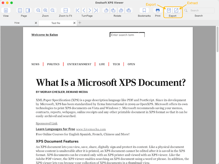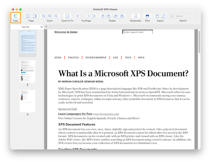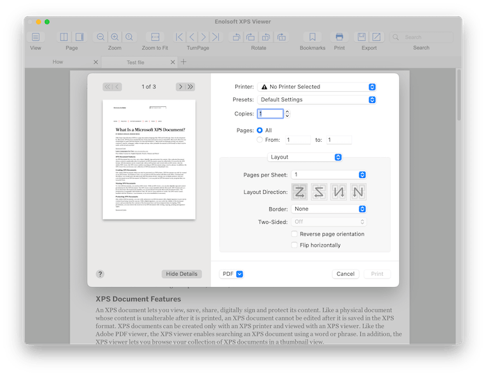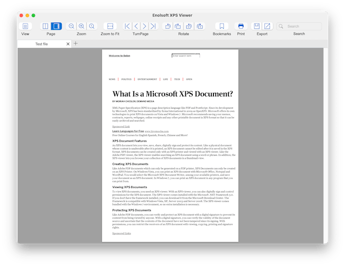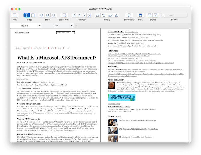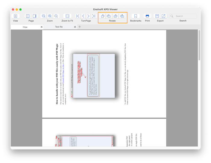 With Enolsoft XPS Viewer, you can open multile XPS files smoothly on your Mac. In additional, you can view XPS files with several viewing tools, including thumbnail sidebar, page view, zoom in/out, rotate and bookmarks. It also lets you print and export to PDF for easy sharing.