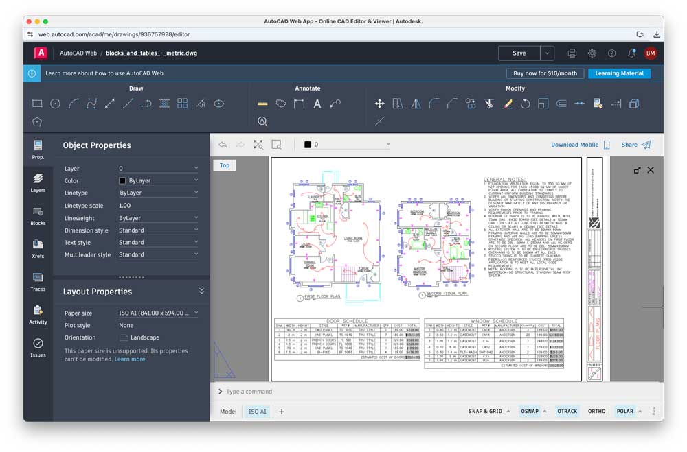 It allows you to use views and properties in your DWG files in the same way as you would in the AutoCAD desktop app. You have Modelspace (Model) and Paperspace (Layout), you can alter your object properties and work with layers. After all the work you can also saving your drawings to the cloud for sharing.