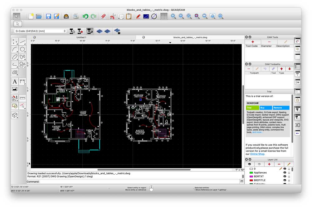 QCAD Community edition is an open-source application that makes opening DWG files very easy. In our test it has better DWG support than LibreCAD and it also has almost all the tools you need to edit a DWG file. For small DWG files it loads very quickly, but for files larger than 30MB it takes a long to open.