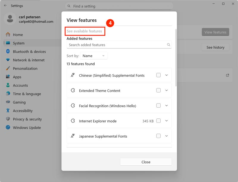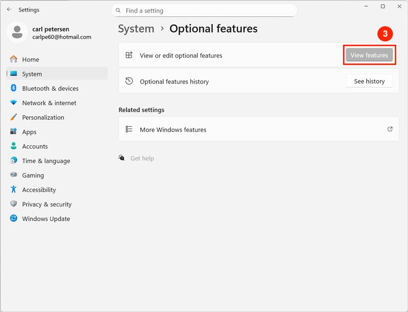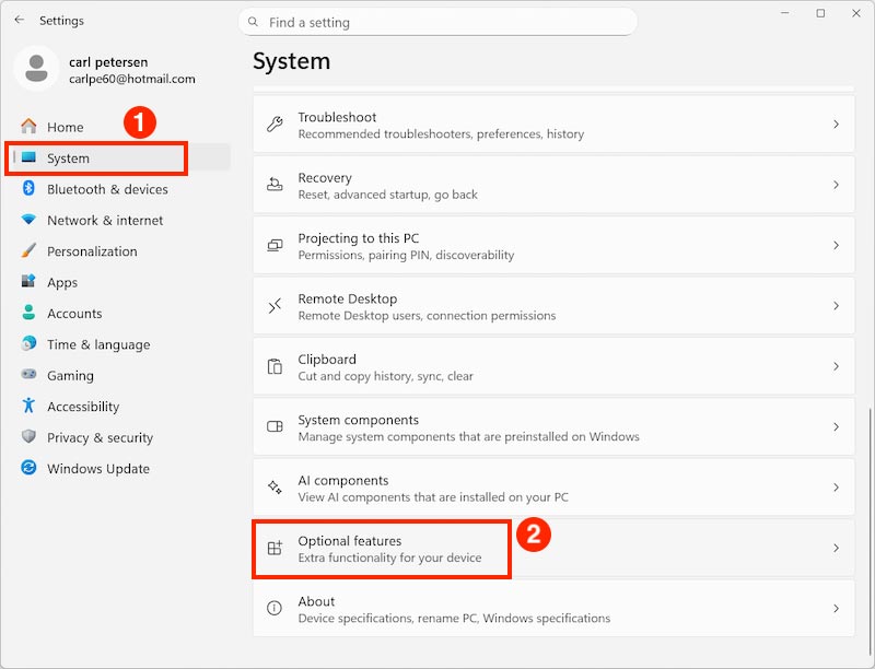 - Go to "System" and click the "Optional features" (scroll down, 2nd last option).