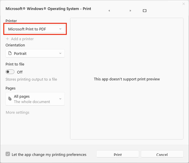 - Click Microsoft Print to PDF from the Print menu.