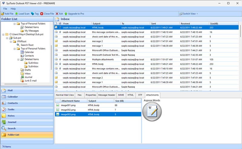 SysTools PST Viewer (Free Edition) is simple software that can view PST files without any file size limitation. Viewing a PST file is totally free. It provides eight display modes for viewing emails and attachments: Normal mail view, Hex, Properties, Message Header, MIME, HTML, RTF, and Attachments.